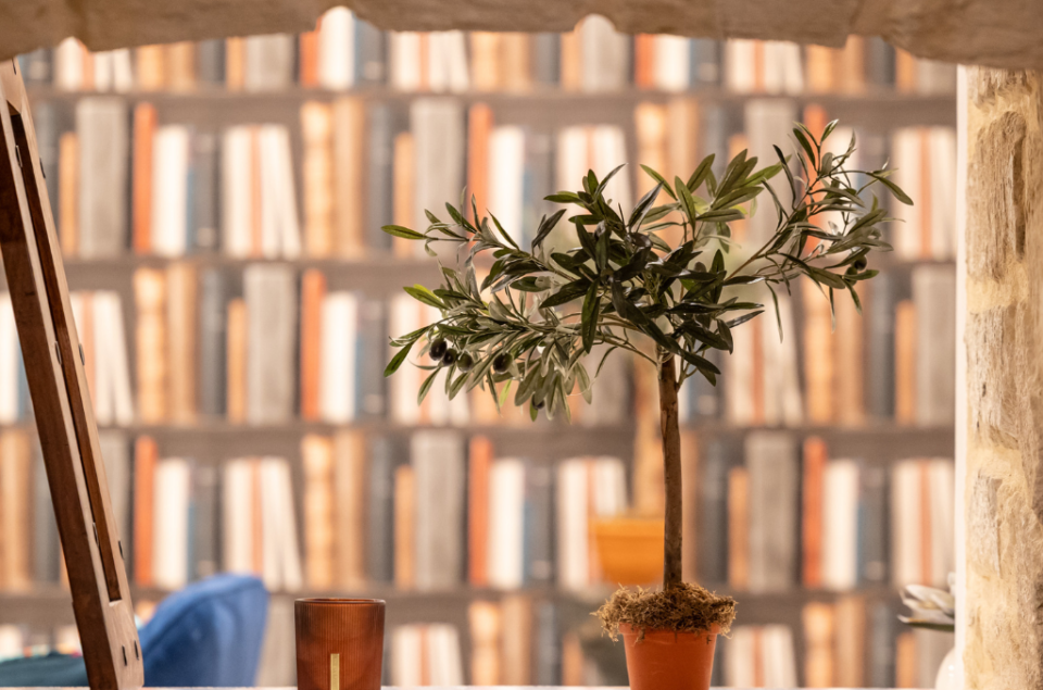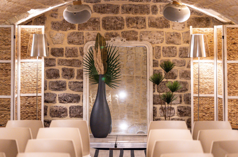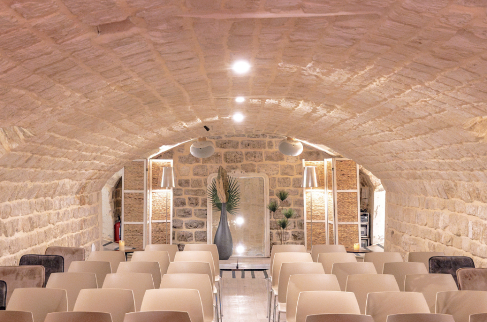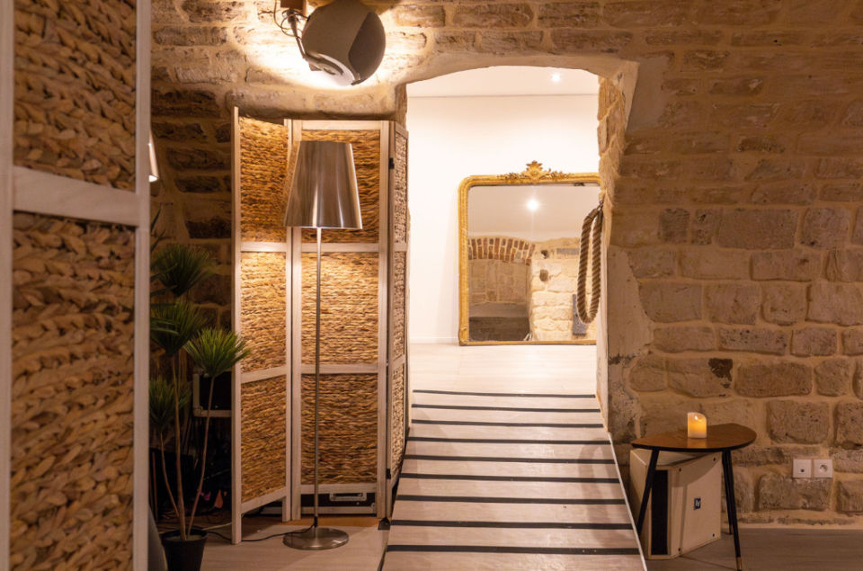 Le Loft de Pierres, situé dans les anciennes caves de la distillerie, est un espace de 200 m² réparti en 3 galeries communiquantes. La décoration mêle des éléments naturels comme des plantes et des pierres, avec du mobilier en velours coloré, apportant une touche moderne à ce cadre authentique.
